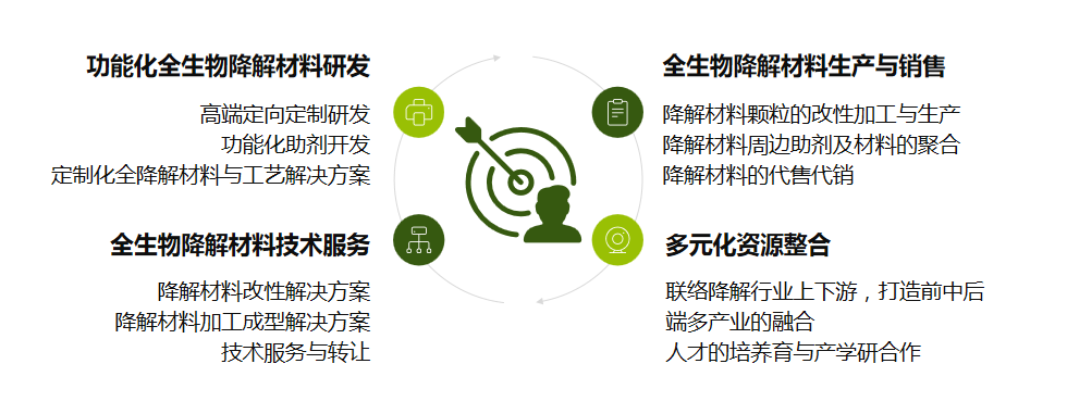 全生物降解材料改性原料生产、功能化助剂开发及生产;全生物降解材料制品回收及再利用。